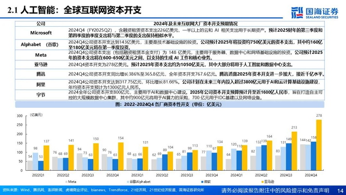 1)需求端:海内外大模型迭代,互联网AI及云计算资本开支加大。2024年,Open AI o1、Claude、Gemini等多模态模型相继诞生。微软、谷歌、腾讯、字节跳动等国内外互联网大厂2024年资本开支大幅增加,预计未来将加大在AI和云计算方面投入。