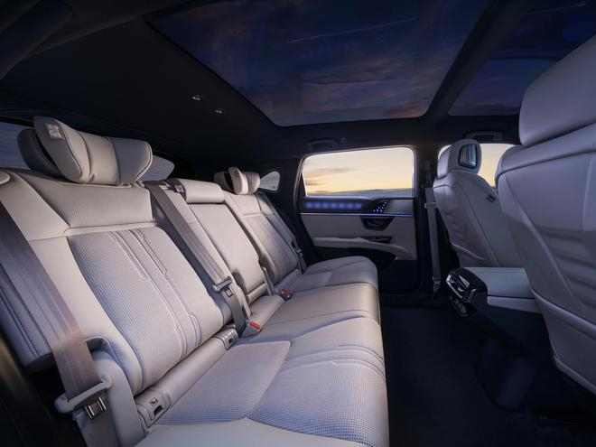 车内采用环保仿麂皮材质,前排座椅进深 510mm,后排座椅进深 500mm,后排座椅还具备28 度 14 档可调功能,全车座椅配备通风加热功能。此外,S7 还配备了智能供暖系统、调光全景天幕、智能香氛系统等。