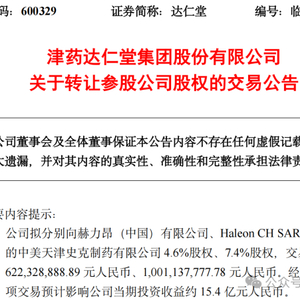天下没有不散的宴席,合资经营40年后,达仁堂和史克的终于还是走到了分手的这一天。2025年4月16日,津药达仁堂集团股份有限公司(600329.SH,以下简称“达仁堂”)发布公告,宣布将其持有的中美天津史克制药有限公司(以下简称“天津史克”)12%股权分别转让给赫力昂(中国)有限公司(4.6%)和瑞士公司Haleon CH SARL(7.4%),交易总金额达16.23亿元。