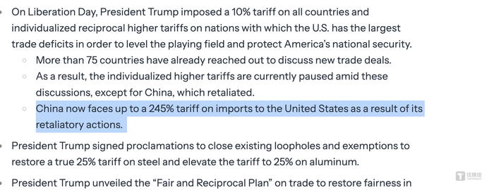 与此同时,特朗普政府在4月15日白宫文件中宣布,对等关税措施公布后,目前已有超过75个国家商讨新的贸易协议,个别提高关税目前已暂停,但中国除外。由于“中国采取报复措施”,目前面临对美国进口产品征收高达245%的关税。