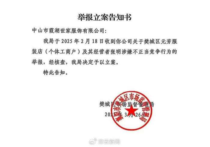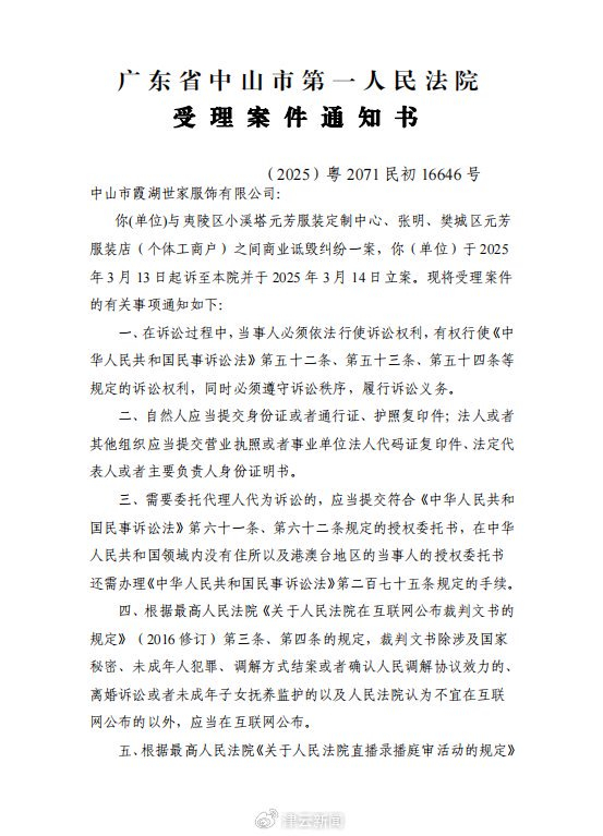 周扬表示,霞湖世家以“商业诋毁”对樊城区元芳服装店、张明、夷陵区小溪塔元芳服装定制中心(以上经营者均为张明)提起诉讼。截止目前,广东省中山市第一人民法院已受理该案,并于2025年3月14日正式立案。