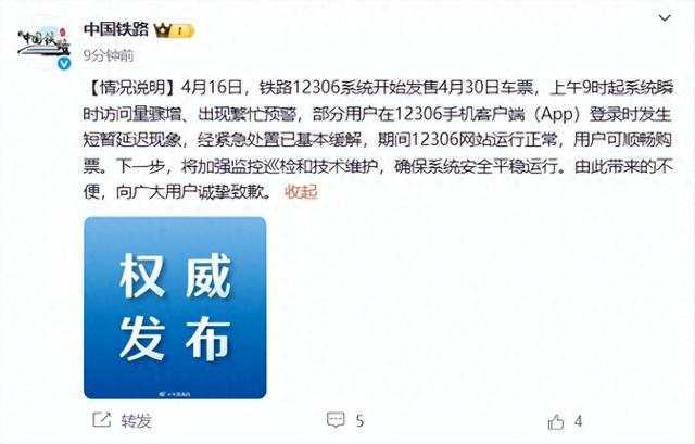 4月16日,铁路12306系统开始发售4月30日车票,上午9时起系统瞬时访问量骤增、出现繁忙预警,部分用户在12306手机客户端(App)登录时发生短暂延迟现象,经紧急处置已基本缓解,期间12306网站运行正常,用户可顺畅购票。下一步,将加强监控巡检和技术维护,确保系统安全平稳运行。由此带来的不便,向广大用户诚挚致歉。