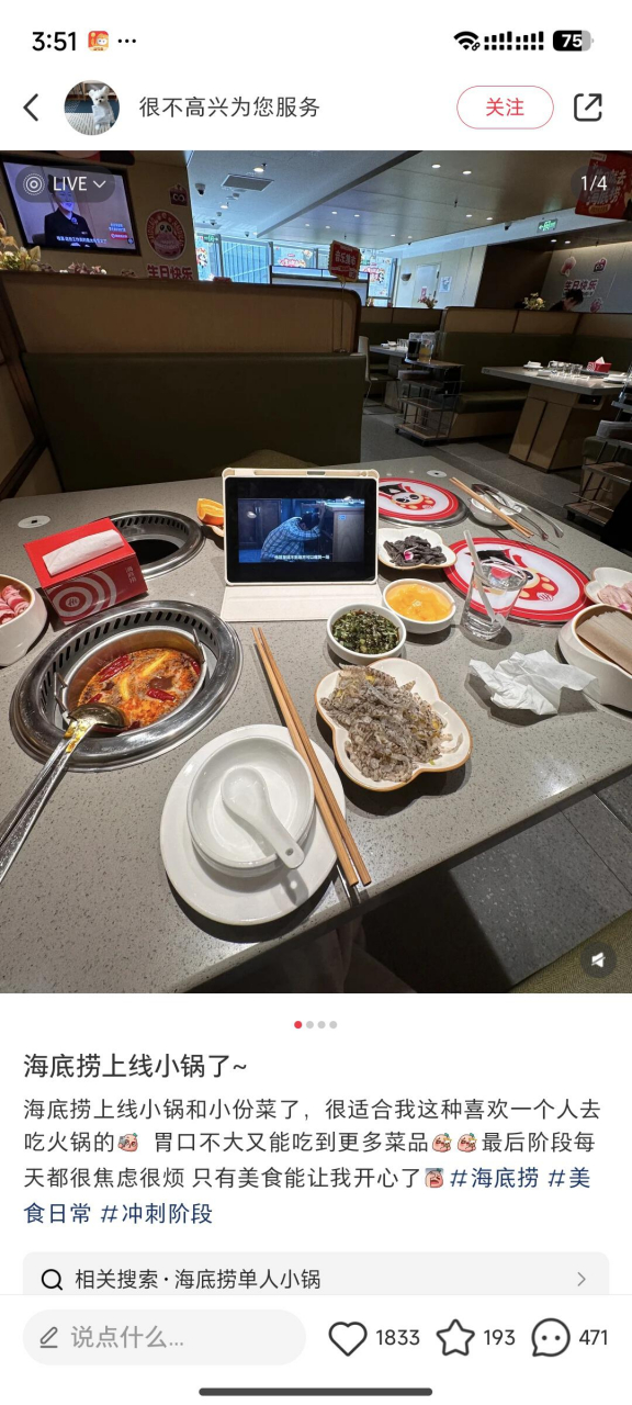 在他们的影响下,火锅的用餐需求开始分化:一方面,多人共食场景收缩,单人或小家庭用餐占比上升。2024年数据显示,单人火锅消费者占比达75%,其中“一人食”场景贡献了午市35%的营收;另一方面,年轻人更倾向于“个人主义”用餐体验,比如边刷剧边吃火锅、独自享受慢食时光。