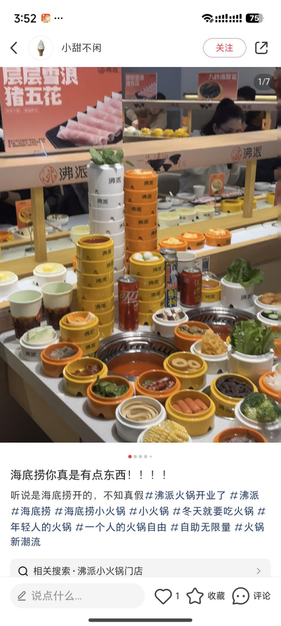 另一方面,海底捞加速布局小锅副牌赛道,持续加码“一人食”市场探索。在此次部分门店试水“小锅”模式前,其已通过多个副牌进行差异化尝试。例如2023年11月推出的「沸派?甄鲜小火锅」,首店落地山东临沂滨河万达广场,以旋转自助小火锅为特色,喊出“排排坐吃火锅,数盘盘人均30+”的口号。