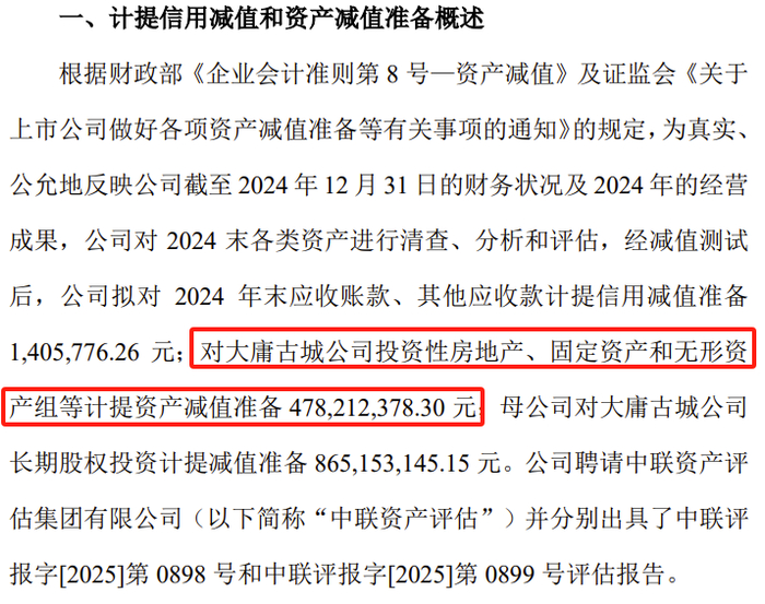 公司2024年巨亏近6亿元的主要原因是:对大庸古城公司投资性房地产、固定资产和无形资产组等计提资产减值准备 478,212,378.30 元。