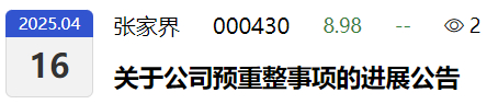 2025 年 4 月 14 日,公司收到张家界中院送达的《决定书》,张家界中院根据预重整临时管理人的申请以及《湖南省张家界市中级人民法院关于企业破产预重整工作指引(试行)》的相关规定,决定将公司预重整期间延长三个月,期限至 2025年 7 月 16 日。
