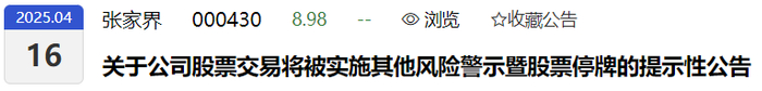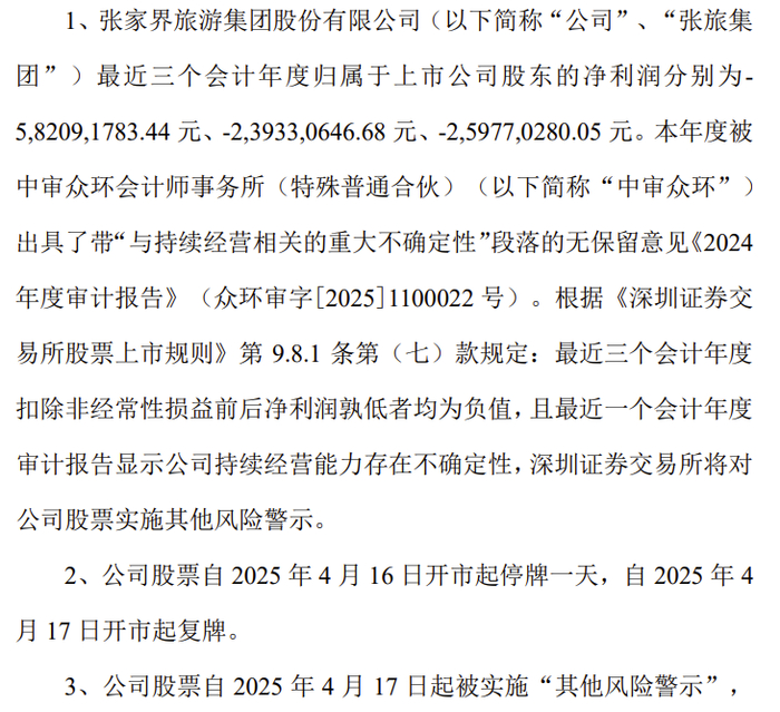 大家印象中,坐拥旅游名山的上市公司肯定是财源滚滚的。但张家界旅游集团股份有限公司(000430)就让人非常意外!4月15日晚,张家界在公布2024年年报、2025年一季报的同时还公布了《关于公司股票交易将被实施其他风险警示暨股票停牌的提示性公告》。公司最近三个会计年度归属于上市公司股东的净利润分别为-5.8209亿元、-2.3933亿元、-2.5977亿元。本年度被中审众环会计师事务所出具了带“与持续经营相关的重大不确定性”段落的无保留意见《2024年度审计报告》。根据深交所《股票上市规则》的规定:最近三个会计年度扣非前后净利润孰低者均为负值,且最近一个会计年度审计报告显示公司持续经营能力存在不确定性,深交所将对公司股票实施其他风险警示。公司股票4月16日停牌一天,自 2025 年 4 月 17 日起被实施“其他风险警示”,股票简称由“张家界”变更为“ST 张家界”。