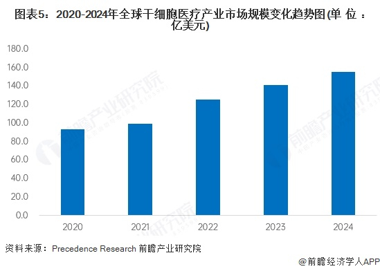 由于干细胞治疗广阔的应用前景,全球干细胞行业迅猛发展,市场规模逐渐扩大。近年来,干细胞研究及应用已成为衡量一个国家生命科学与医学发展的重要指标,许多国家对干细胞研究大力支持。据Precedence Research数据,2020年全球干细胞医疗市场规模达93.0亿美元,2023年全球干细胞市场规模为150.9亿美元。初步统计2024年全球干细胞医疗市场规模为155.0亿美元。