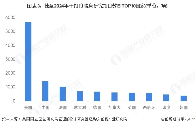 根据全球最大临床试验注册平台——美国国立卫生研究院管理的临床研究登记系统(Clinicaltrials.gov)统计数据,截至2024年,全球登记的干细胞临床研究项目共计13023项。目前全球登记的干细胞临床研究项目主要是成体干细胞临床试验,涉及血液病、肿瘤、神经系统疾病、心脏疾病、免疫系统疾病等领域,其中美国保持绝对领先的地位。