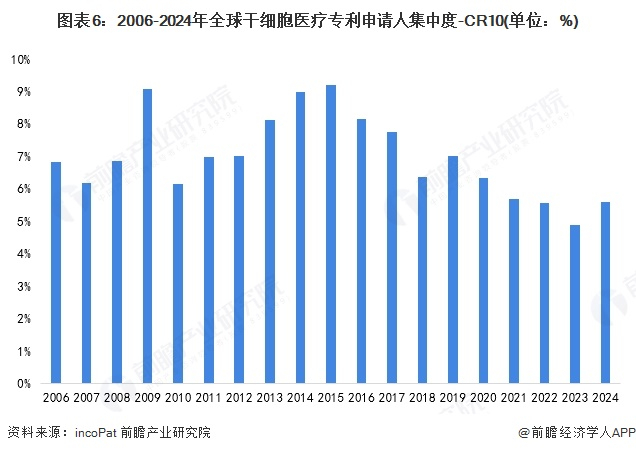2006-2024年间,全球干细胞医疗行业的专利申请人集中度整体呈波动变化的趋势,2015年达到最高点(9.19%)。这一趋势表明,行业内的竞争激烈,市场集中度始终低于10%。