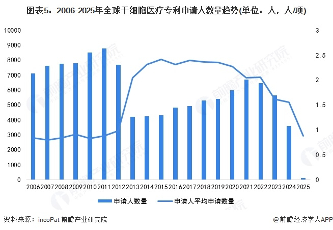2006-2024年间,全球干细胞医疗行业的申请人数量和平均申请数量呈现出波动变化的趋势。申请人数量在2011年达到峰值,随后下降后又增长,但行业参与者数量较2019年还是有所减少。平均申请数量自2013年起显著上升,在2013-2015年间达到较高水平,显示出这一时期行业研发热度较高。自2018年起,平均申请数量逐步下降。总体来看,2013-2015年是行业技术研发的高峰期,此后申请人数量和研发热度进入下行通道,反映出行业技术逐渐趋于成熟,竞争压力加大,创新动力有所减弱。