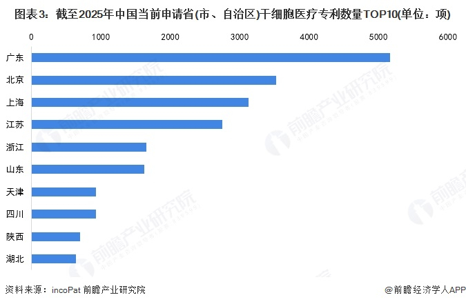 从中国干细胞医疗行业的专利分布来看,广东以5170项专利领先,显示出其在技术创新和研发方面的优势。北京和上海分列第二、第三。江苏和浙江紧随其后,进一步凸显了长三角地区在行业创新中的重要地位。整体来看,干细胞医疗行业的专利申请主要集中在华南及华东地区,区域创新能力具有明显的集中趋势。