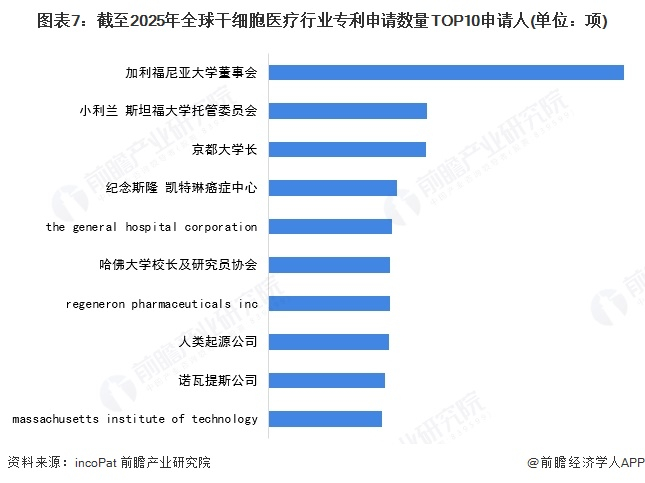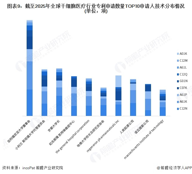 在全球干细胞医疗行业中,专利申请数量排名前十的申请人主要以国外企业为主。其中,加利福尼亚大学董事会以2703项专利领先。小利兰 斯坦福大学托管委员会和京都大学长分别排名第二和第三。总体来看,国外企业在干细胞医疗领域的专利布局占据主导,集中体现了国外在该行业的创新驱动相对领先。