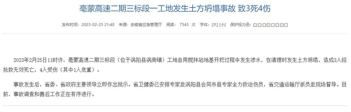 2023年2月25日11时许,安徽省亳蒙高速二期三标段(位于涡阳县涡南镇)工地自用搅拌站地基开挖过程中发生渗水,在清理时发生土方坍塌,造成3人经抢救无效死亡、4人受伤(其中1人危重)。