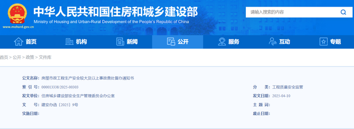 4月10日,住建部安委办就该事故发布查处督办通知书。