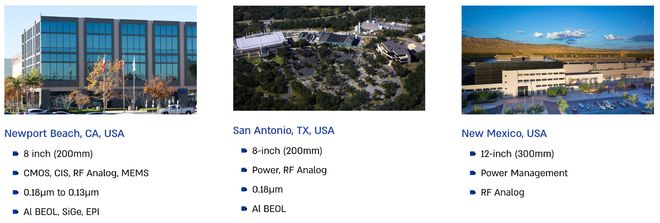 公司在美国(加利福尼亚州纽波特比奇和得克萨斯州圣安东尼奥)拥有两座晶圆厂(200毫米),并可使用英特尔新墨西哥工厂的300毫米产能走廊,主要生产CMOS、CIS、射频模拟、MEMS、电源等。