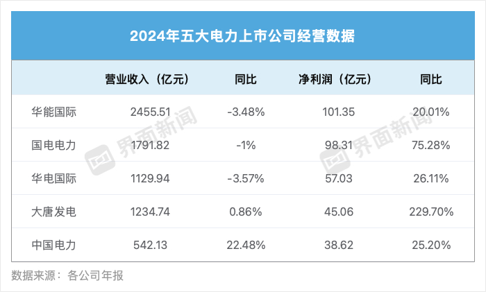 中国华电集团的华电国际(600027.SH)在2024年实现净利57.03亿元,同比增26.11%;国家电投集团旗下中国电力(02380.HK)净利为38.62亿元,同比增25.2%。