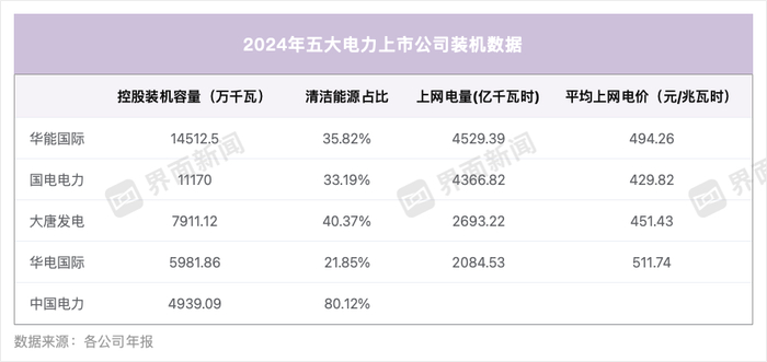 截至2024年末,华能国际控股装机容量最高,达到14512.5万千瓦,清洁能源占比为35.82%,同比提升4.58个百分点。