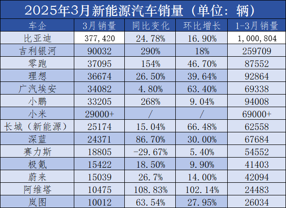 【金银河·关注】2025年3月新能源汽车销量出炉!比亚迪25年第一季度销量已突破100万辆