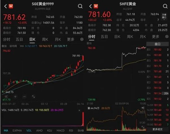 当日,国内金价也首次站上780元/克关口,截至4月16日收盘,上海黄金交易所现货黄金(Au99.99)盘中最高价为781.9元/克,沪金主力合约盘中最高价为782.38元/克。