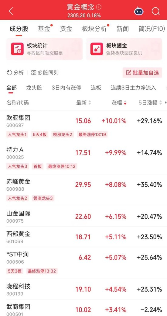 板块中,欧亚集团、特力A、*ST中润收于涨停,赤峰黄金、山金国际、西部黄金涨幅分别为8.08%、6.15%和5.11%。
