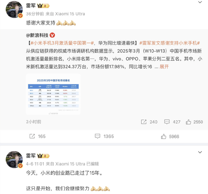 此次发声距雷军上次在社交平台发文已时隔9天,也是他在四月过半后的第三次微博动态。前两次分别是纪念小米创业15周年,他发布短评:“今天,小米的创业路已走过了15年。这只是开始,我们会继续努力。”