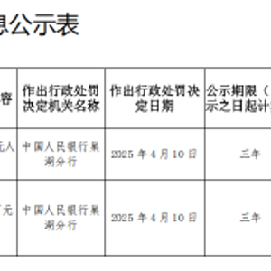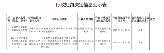 4月16日金融一线消息,据中国人民银行巢湖分行行政处罚决定信息公示表显示,安徽肥东湖商村镇银行股份有限公司因未按规定开展持续的客户身份识别(含重新识别),被处罚款21万元人民币。