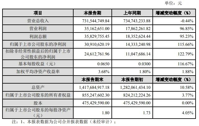 截至报告期末,金力泰总资产为14.18亿元,较期初增加10.58%;归属于上市公司股东的所有者权益为8.55亿元,较期初增加3.77%;归属于上市公司股东的每股净资产为1.8元,较期初增加4.05%。