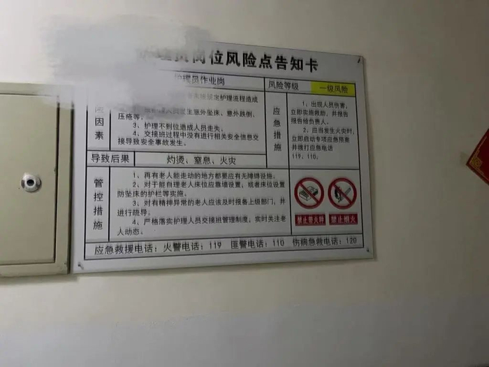 在隆化县另一乡村养老院,记者在墙上看到消防疏散示意图,以及一则《护理员岗位风险点告知卡》,提醒护理员:“发生火灾时,立即启动专项应急预案并拨打应急电话119、110。”