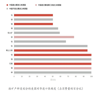 美国目前对这些矿物的进口依赖度极高,在50种关键矿产中,12种完全依赖进口,29种进口依赖超50%,且中国在关键矿产生产和加工上占据主导。过去两年以来,中国对锑、镓、锗实施出口管制,并且中国作为全球最大的稀土和关键矿物供应国,占美国关键矿物进口的64%,在加工能力上更是全球主导,令美国供应链面临巨大风险。