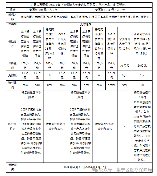 普惠版+:年保障2400元,报销以200元/月/次为限,全年12次,0免赔,赔付比例50%。特定既往症不予赔付。2025年度的内蒙古惠蒙保参保人,如在2024年保险合同保障期内确诊本产品方案中约定的特定既往症,2025年度连续投保,则按照本方案中约定的偿比例进行赔偿。