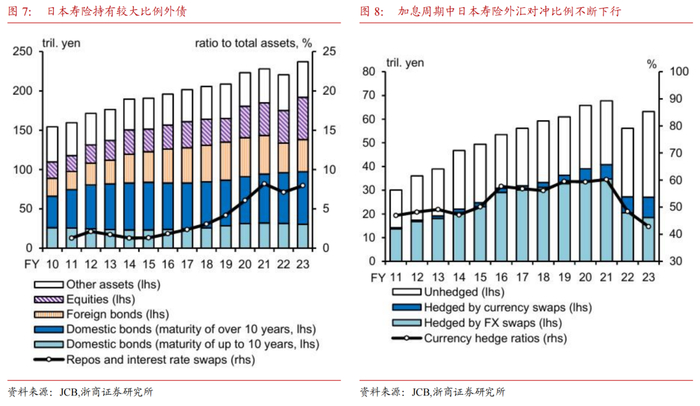 亚洲金融机构套期保值比例下降,汇率风险加大。一是日本方面,2024年日本金融稳定报告指出,日本金融机构在过去增加海外债持有规模,截至2024年Q2在加息周期中依然通过日元贬值获得了正收益,且由于海外包括对冲成本在内的外汇融资成本较高,日本寿险货币对冲比例在近两年下降,从21年约60%降至23年约40%。二是中国台湾地区也有相似问题,例如中国台湾地区寿险资产端拥有约4600亿美元外币资产,约占总资产的40%,其中有约57%进行了套期保值,还有约2000亿美元未进行套期保值。考虑2024年中国台湾地区GDP仅约7956亿美元,未套保的险资外币资产约占中国台湾地区GDP的25%。