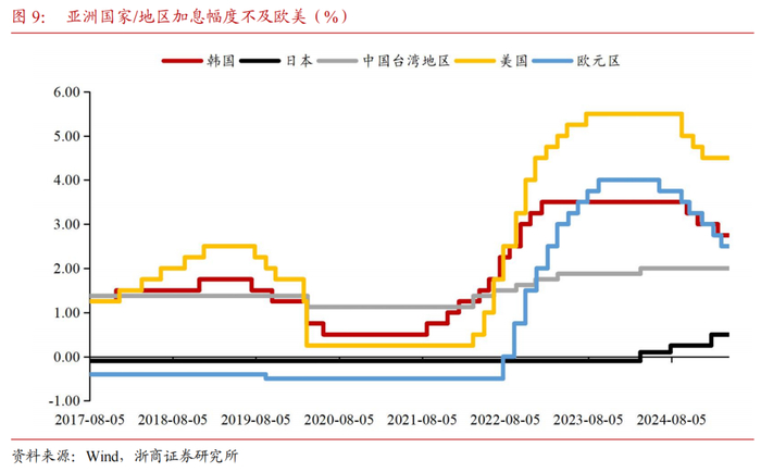 2023年后亚洲投资者持有长期美元债券规模不断升高,根据美国财政部统计,截至2024年Q4日本、韩国、中国台湾地区分别持有1.52万亿、0.2万亿、0.65万亿美元美债,分别占GDP的38%、11%、82%,较2022年Q4占比36%、10%、74%均有提升。
