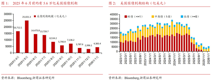 国债到期节奏上来看相对平稳。从全年到期结构来看2025年1至4季度分别有6.6、5.9、2.6、1.4万亿美元美国国债到期,其中1年期以下债券分别到期5.5、4.8、1.4、0.2万亿美元;1至5年期债券分别到期0.6、0.7、0.7、0.7万亿美元、5年及以上债券分别到期0.4、0.4、0.5、0.4万亿美元。可以看出,6月前美国国债“集中到期”主因短债续作问题,2025年1至3月美国财政部共发行3个月以内短债3.1万亿美元,后续年末未偿美债余额也会因短债续作而有所上升。