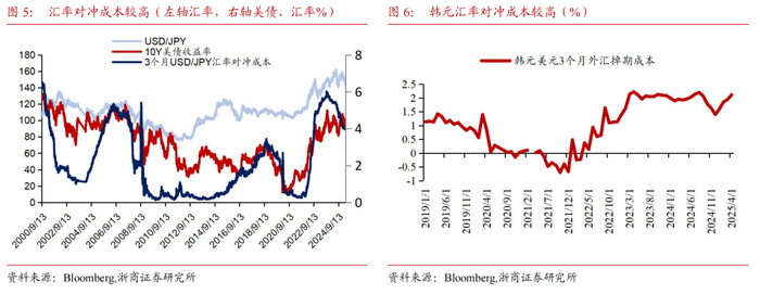 过去两年套期保值成本不断升高。本轮美元加息周期中亚洲国家/地区通胀韧性明显较低,央行加息幅度不及美欧,导致利差走阔汇率承压,各国外汇套期保值成本均处于历史高位。加息周期中3个月日元兑美元汇率掉期成本从2021年底0.3%升至2025年4月4.1%;3个月韩元兑美元汇率掉期成本从2021年底-0.7%升至2025年4月2.1%。