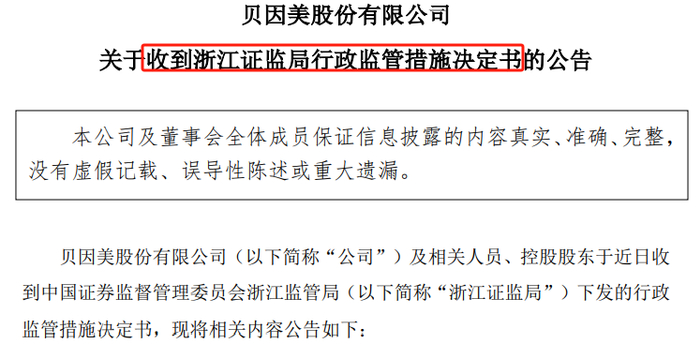 浙江证监局在现场检查中发现贝因美存在三方面问题,公司、公司控股股东及公司时任董事长、财务总监、董秘等均被采取出具警示函的监管措施。