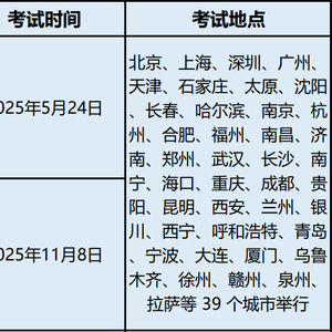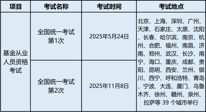 根据中国证券投资基金业协会及人力资源社会保障部最新公告,2025 年基金从业资格全国统一考试将分别于5 月 24 日和11 月 8 日举办,覆盖全国 39 个主要城市。以下为考试安排及报名须知: