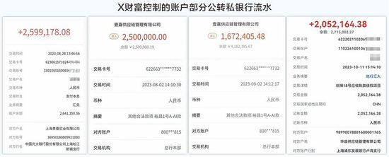 其中,私转公(投资人向X财富控制的公司转账)流水超1800笔,涉及总金额14.04亿元,交易场景为购买特定“理财产品”,单笔转账金额最高达到1000万元;公转私(X财富控制的公司向投资人转账)流水超1900笔,涉及总金额13.97亿元,交易场景为“兑付”本金和收益,单笔转账金额最高的超过3000万元。
