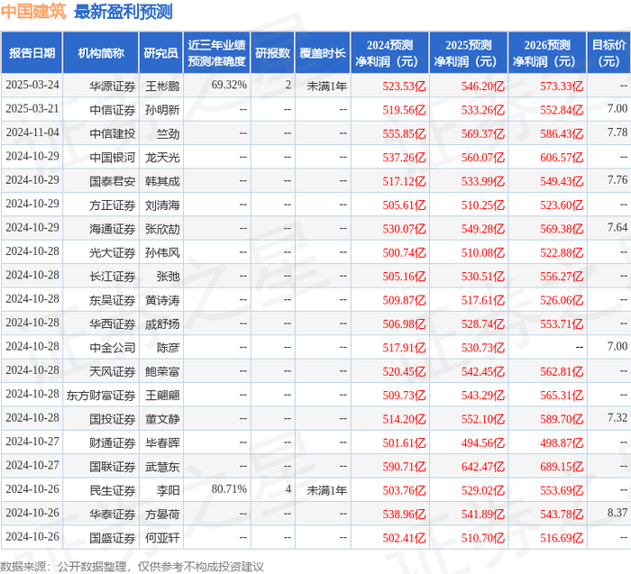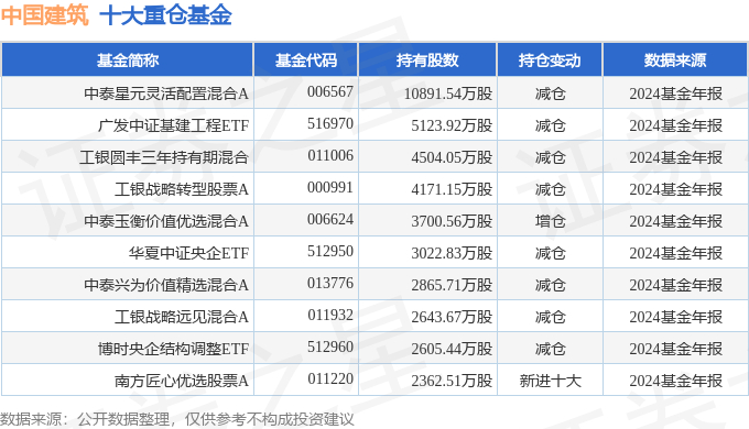持有中国建筑最多的基金为中泰星元灵活配置混合A,目前规模为53.29亿元,最新净值2.631(4月16日),较上一交易日上涨0.5%,近一年上涨7.08%。该基金现任基金经理为姜诚。