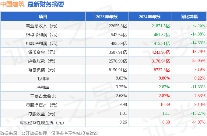 据证券之星公开数据整理,近期中国建筑(601668)发布2024年年报。根据财报显示,中国建筑净利润减14.88%。截至本报告期末,公司营业总收入21871.48亿元,同比下降3.46%,归母净利润461.87亿元,同比下降14.88%。按单季度数据看,第四季度营业总收入5606.07亿元,同比下降5.67%,第四季度归母净利润64.84亿元,同比下降38.89%。