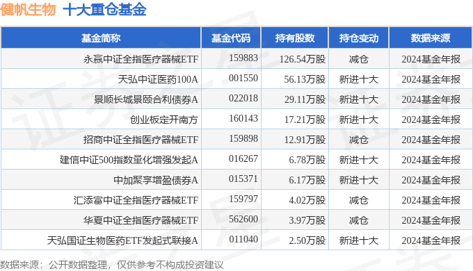 持有健帆生物最多的基金为永赢中证全指医疗器械ETF,目前规模为17.23亿元,最新净值0.4599(4月16日),较上一交易日下跌1.25%,近一年下跌5.63%。该基金现任基金经理为储可凡。