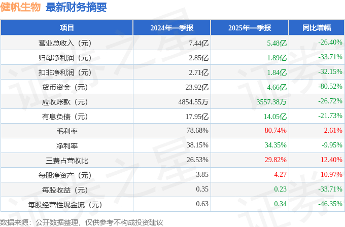 健帆生物2025年一季报简析:净利润减33.71%