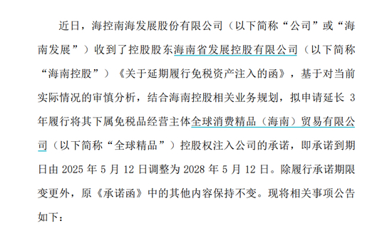 3月28日晚间,海南发展公告称,公司收到了控股股东海南控股《关于延期履行免税资产注入的函》,拟申请延长3年履行将其下属免税品经营主体全球消费精品(海南)贸易有限公司(以下简称“全球精品”)控股权注入公司的承诺,即承诺到期日由2025年5月12日调整为2028年5月12日。