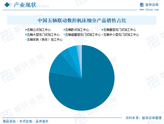 五轴联动数控机床产品包括五轴立式加工中心、五轴卧式加工中心、五轴龙门加工中心以及五轴车铣(铣车)加工中心等,其中立式五轴是下游客户需求量最大的机型,卧式五轴由于质量高、价格贵,常用于大型汽车自动化产线项目。数据显示,目前,在我国五轴联动数控机床细分产品中,五轴立式加工中心销售量占比最高,达77.7%;其次为五轴卧式加工中心,其销量占比达10.9%;而后依次为五轴重型龙门式加工中心、五轴大型龙门式加工中心、五轴超重型龙门式加工中心、五轴中小型龙门式加工中心、五轴车铣(铣车)加工中心,销售量所占比例分别为4.4%、4.3%、1.1%、0.9%、0.6%。
