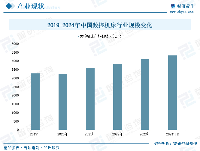 数控机床(CNC,Computer Numerical Control)又被誉为“工业母机”,是工业生产中最重要的工具之一,为装备制造业提供智能的生产设备和零部件,在整个工业体系中处于基石的地位。近年来,随着国家政策支持力度增强,我国机床企业技术创新投入日益增加,数控机床行业得以呈现快速发展态势,产业规模持续扩大,市场运行状况稳中向好。据统计,2023年,全国数控机床市场规模已从2019年的3270亿元增长至4090亿元左右,近五年的年均复合增长率为5.75%左右,根据市场发展趋势进行预测,2024年国内数控机床行业规模将达到4325亿元。