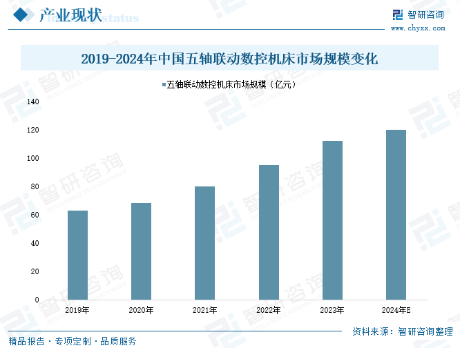 五轴联动机床五轴联动机床在加工过程中可同时控制五个轴的运动,从而实现对复杂几何形状零件的高效和精确加工,其适用范围更广、加工质量更精、工作效率更高,在航空航天、精密机械等行业的生产中具有重要作用,是高端机床的代名词,被誉为机床工业“皇冠上的璀璨明珠”。目前国内机床企业的高端化正在进行时,五轴联动数控技术作为衡量一个国家复杂精密零件制造能力技术水平的重要标准之一,近年来国内市场得以快速发展。数据显示,2023年,我国五轴联动数控机床市场规模已由2019年的62.9亿元增长至112亿元,年均复合增长率达15.52%;根据市场预测,2024年国内五轴联动数控机床市场规模将进一步增长至120亿元。
