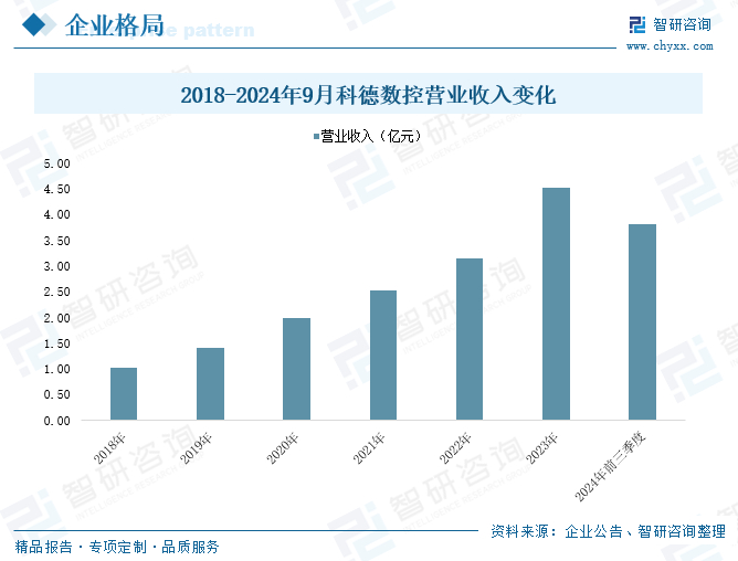 科德数控股份有限公司成立于2008年01月28日,2021年7月9日正式在上海证券交易所科创板挂牌上市,股票简称“科德数控”。科德数控是从事五轴联动数控机床及其关键功能部件、高档数控系统的设计、研发、生产、销售及服务于一体的高新技术企业,是国内极少数自主掌握高档数控系统及高端数控机床双研发体系的创新型企业。目前科德数控已成长为国内颇具规模的五轴装备产销基地,公司主营产品有KMC系列五轴立式(车铣复合)加工中心、KTX/KTM系列五轴铣车复合加工中心、GMA/B系列五轴高速桥式龙门加工中心、KToolG系列五轴工具磨削中心、KTFMS系列五轴铁磨复合加工中心等。数据显示,2024年前三季度,科德数控营业收入为3.81亿元,同比增长30.32%。