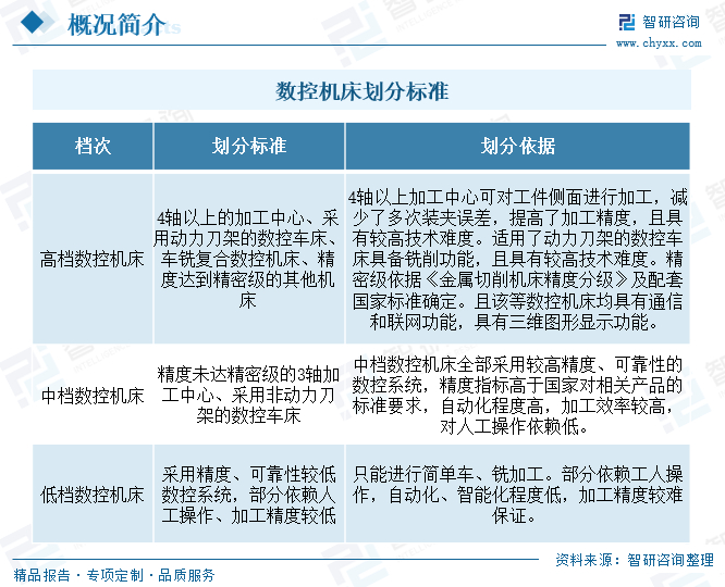 数控机床可分为低档、中档和高档数控机床,其中,高档数控机床的划分标准为:4轴以上的加工中心、采用动力刀架的数控车床、车铣复合数控机床、精度达到精密级的其他机床。目前,国内低档数控机床的产能比较过剩,行业竞争压力较大;但对加工质量和精度较高的高档数控机床,国内整体水平与国外先进水准仍有一定差距,行业正在加速追赶。