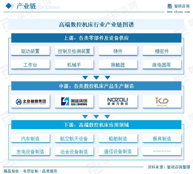 高端数控机床行业产业链上游主要为数控机床所需的各类零部件及设备供应环节,包括驱动装置、控制及检测装置等数控系统,铸件、精密件等主体零部件,工作台、机械手等功能部件,接触器、继电器等电子元件,等等。产业链中游为各类数控机床产品生产制造环节,市场参与者有德普数控、诺倬力、科德数控、浙海德曼、创世纪、海天精工、华东数控、秦川机床、亚威股份、日发精机等。下游为高端数控机床应用领域,主要包括汽车制造、航空航天设备制造、船舶制造、模具制造、发电设备制造、冶金设备制造、通信设备制造等制造业。