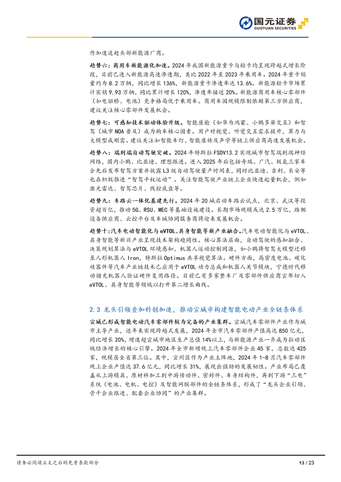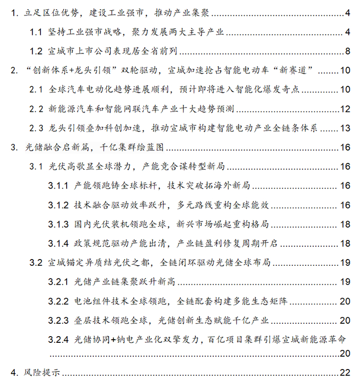 宣城市立足长三角区位优势,积极落实“2+3+4”产业链专班“七个一”工作机制,聚焦汽车零部件和新能源两大主导产业,培育壮大“千亿产业”集群,推动经济高质量发展,同时也带动了资本市场的繁荣。本报告重点关注宣城两大主导产业,对相关产业在全国乃至世界的总体布局、技术趋势、市场趋势进行分析,为企业家解读安徽省产业政策规划、为投资人挖掘产业投资机遇、为政府机构梳理产业链上下游关键节点。